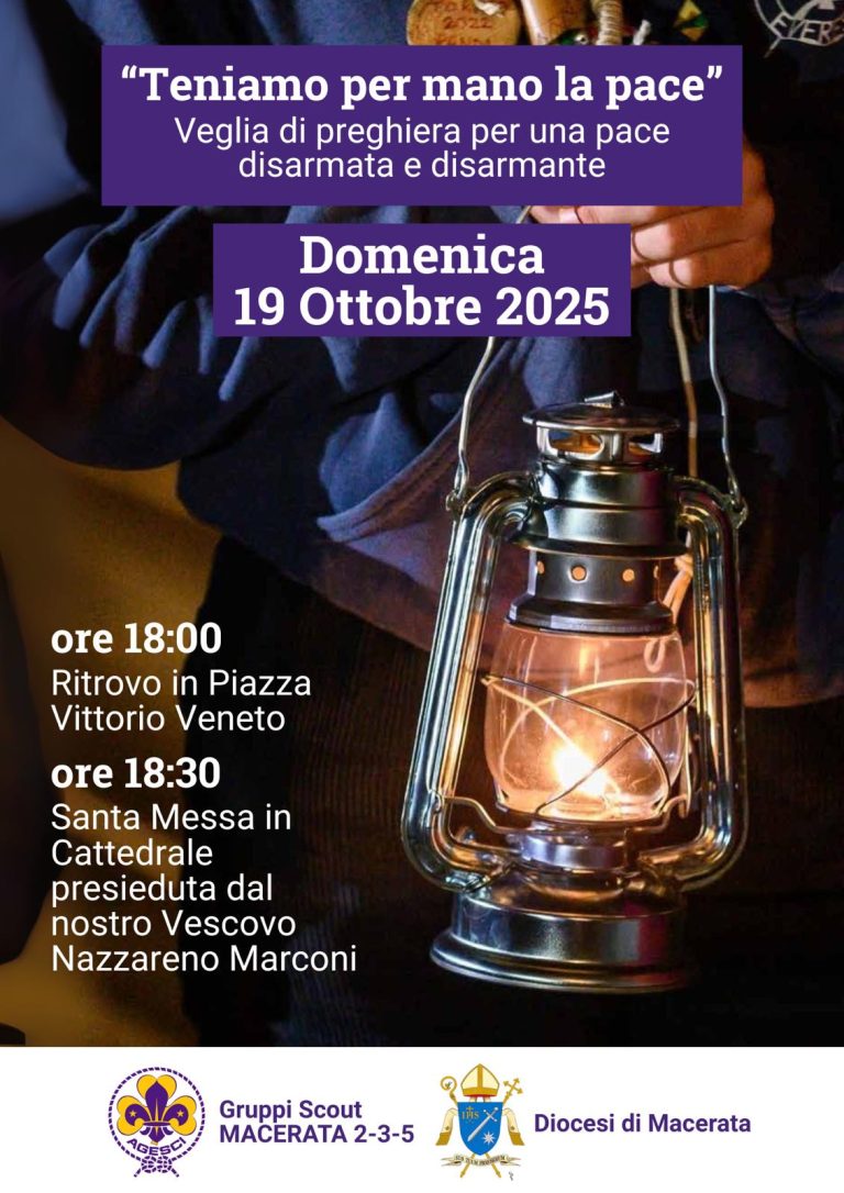 14 Ottobre 202519 Ottobre: “Teniamo per mano la Pace” – Cattedrale di San Giovanni 19 Ottobre: “Teniamo per mano la Pace” veglia di preghiera con Santa Messa presieduta da S.E. Mons. Nazzareno Marconi alle ore 18:30 presso la Cattedrale di San Giovanni -Macerata condividi su