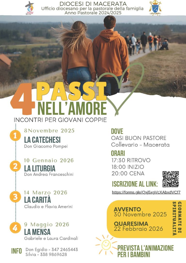 Carissime famiglie, ripartono gli incontri dedicati alle giovani coppie ed il primo appuntamento è per sabato 8 novembre alle ore 17,30 all’Oasi Buon Pastore di Macerata. Vi chiediamo di iscrivervi al seguente link per organizzare l’animazione per i bambini: https://forms.gle/Qxj5xgVcXAbxdVCf7