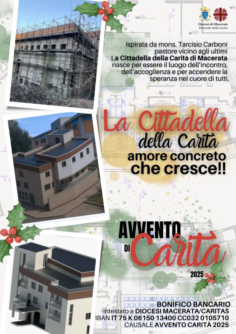 28 Novembre 2025Avvento di Carità 2025: La cittadella della Carità Avvento di Carità 2025: La cittadella della Carità Bonifico Bancario intestato a Diocesi Macerata/Caritas IBAN: IT 75 K 06150 13400 CC032 01057 10 Causale: Avvento di Carità 2025 condividi su