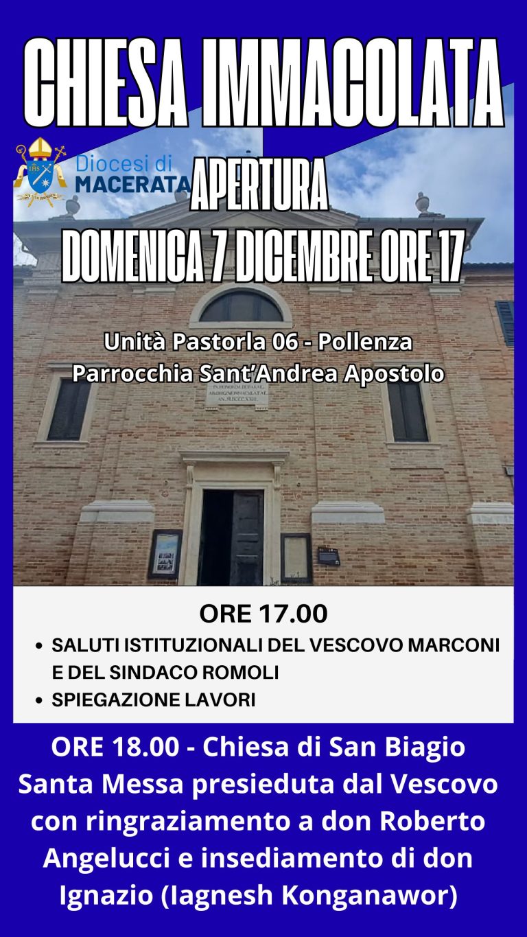 1 Dicembre 20251 Dicembre 20257 Dicembre: Apertura Chiesa Immacolata – Pollenza 7 Dicembre: Apertura Chiesa Immacolata con i saluti istituzionali di S.E. Mons. Nazzareno Marconi e del Sindaco alle ore 17:00 e a seguire la Santa Messa presieduta dal Vescovo della Diocesi di Macerata – Parrocchia Sant’Andrea Apostolo, Pollenza condividi su Apertura Immacolata Pollenza