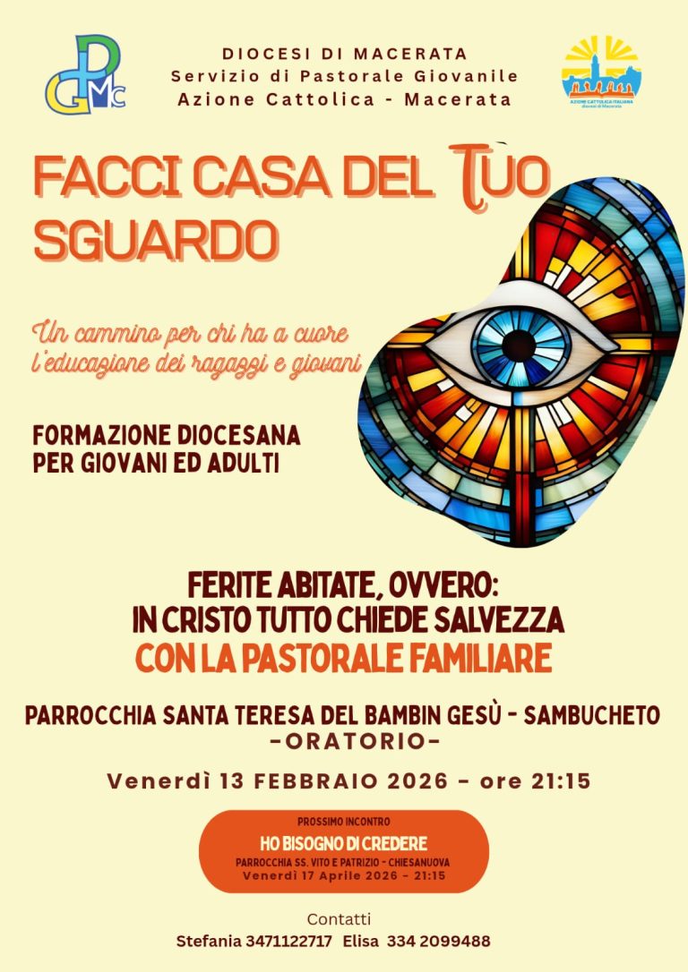 28 Gennaio 202613 Febbraio: “Facci casa del Tuo sguardo” Formazione diocesana per giovani e adulti – Macerata 13 Febbraio: Formazione diocesana per giovani e adulti presso la parrocchia Santa Teresa del bambin Gesù alle ore 21:15 – Sambucheto condividi su