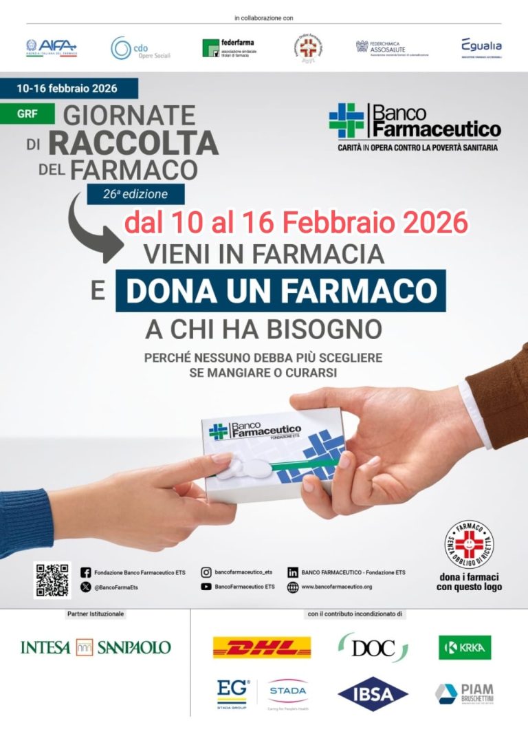 Anche quest’anno, si svolgeranno le GRF Giornate di Raccolta del Farmaco. Dureranno una settimana, da martedì 10 a lunedì 16 febbraio 2026.