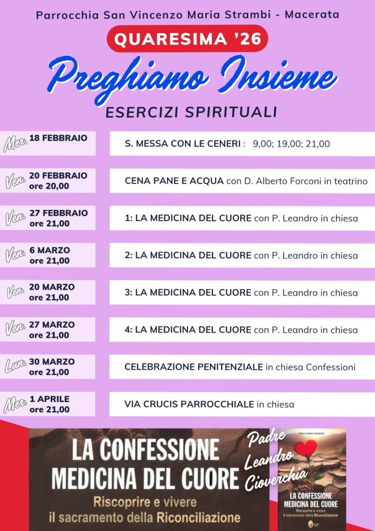 9 Febbraio 2026Quaresima 2026: “Preghiamo insieme” Esercizi Spirituali – Parrocchia San Vincenzo Maria Strambi Quaresima 2026: “Preghiamo insieme” Esercizi Spirituali presso la Parrocchia San Vincenzo Maria Strambi – Macerata condividi su