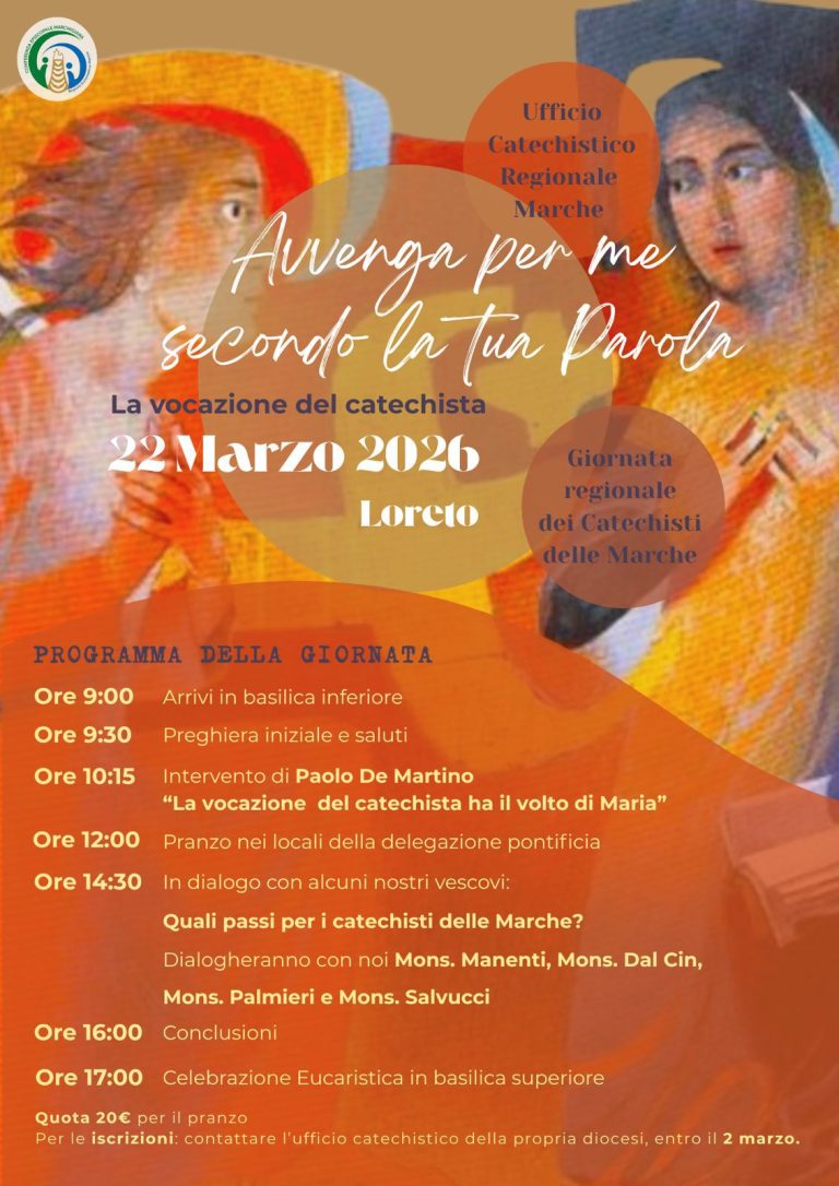 17 Febbraio 202617 Febbraio 202622 Marzo: La vocazione del catechista – Loreto 22 Marzo: “Avvenga per me secondo la tua Parola” Giornata regionale dei Catechisti delle Marche – Loreto condividi su