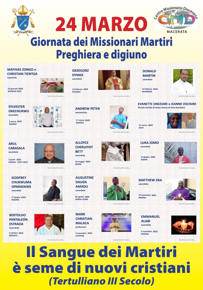 Il 24 marzo 2026 celebriamo la trentaquattresima Giornata dei Missionari Martiri. Questo giorno ci invita a ricordare coloro che hanno donato la propria vita nel servizio e nel Vangelo e a riconoscere la presenza viva e operante di testimoni che hanno scelto di portare il Vangelo nei luoghi dove la vita e la dignità umana sono maggiormente minacciate. Vi invito a stampare il manifesto e metterlo all’ingresso della Chiesa, credo che sia una autentica testimonianza per iniziare la Settimana Santa.