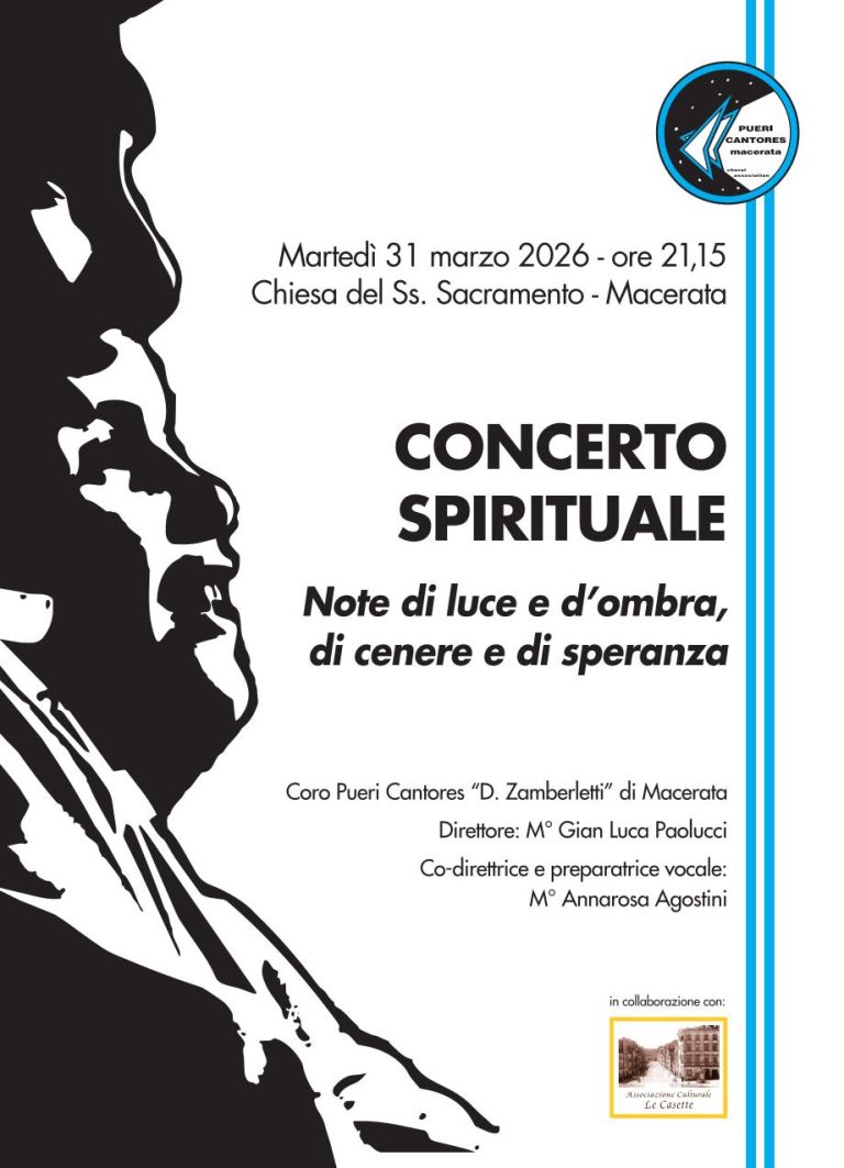 30 Marzo 202631 Marzo: Concerto spirituale – Chiesa del Santissimo Sacramento – Macerata 31 Marzo: Concerto spirituale “note di luce e d’ombra, di cenere e di speranza presso la Chiesa del Santissimo Sacramento alle ore 21,15 – Macerata condividi su 31-03 Concerto spirituale
