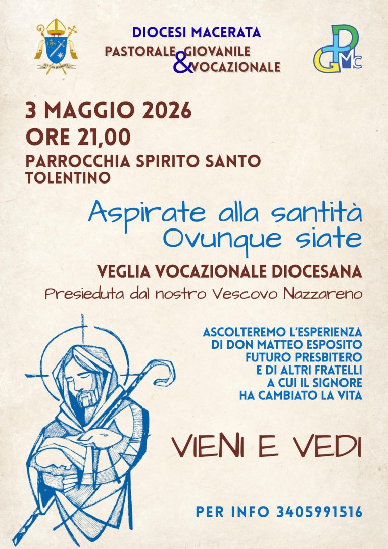 20 Aprile 202620 Aprile 20263 Maggio: Veglia Vocazionale Diocesana – Tolentino 3 Maggio: Veglia Vocazionale Diocesana presso la Parrocchia Spirito Santo alle ore 21:00 – Tolentino condividi su