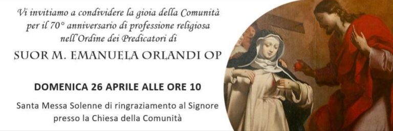 26 Aprile: 70° Anniversario di professione religiosa nell’Ordine dei Predicatori di Suor M. Emanuela Orlandi OP con Santa Messa alle ore 10:00 presso la Chiesa della Comunità