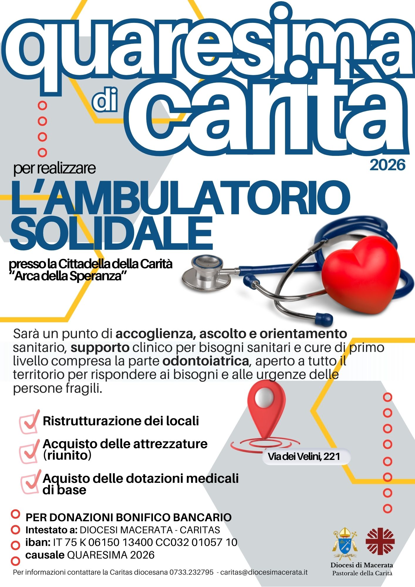 La Quaresima di Carità 2026 sarà dedicata a un progetto concreto di solidarietà: il completamento dell’Ambulatorio solidale che nascerà all’interno della Cittadella della Carità “L’Arca della Speranza”. L’iniziativa nasce dal desiderio di offrire una risposta reale ai bisogni sanitari che emergono con sempre maggiore frequenza tra le persone più fragili, spesso costrette ad affrontare difficoltà nell’accesso alle cure.