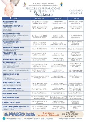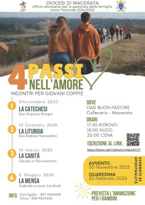Incontro per coloro che accompagnano le coppie alla celebrazione del Sacramento del Matrimonio e a coloro che dedicano il proprio servizio ai gruppi di famiglie: 26 novembre 2025 e 4 febbraio 2026, alle ore 21:00 presso Oasi Buon Pastore – Collevario Macerata Per il primo incontro di novembre questo il link per iscriversi: https://forms.gle/5vTgQQ48NBwxviLw8