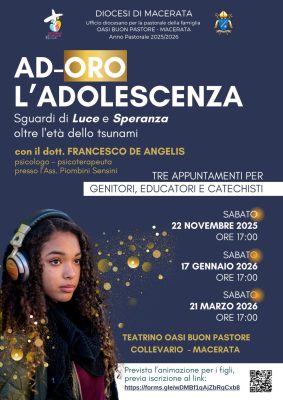 22 Novembre: Ad-oro l’adolescenza. Primo appuntamento per genitori, educatori e catechisti presso il teatrino oasi Buon Pastore di Collevario – Macerata