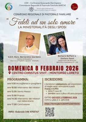 Domenica 8 Febbraio: Convegno regionale di Pastorale Familiare dedicato a tutti gli operatori di pastorale familiare, alle famiglie e a tutti coloro che hanno a cuore il servizio alla famiglia presso il Centro Christus Vivit – Montorso Loreto. L’iscrizione è obbligatoria per organizzare gli spazi, l’animazione per i figli ed i pasti: https://forms.gle/cCdS4MTuC6GT63w1A